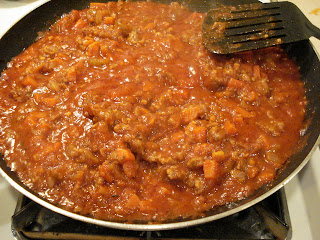 I started, as most dishes I cook do, with frying a cut up onion, a large onion. I skinned the sausages and added the meat to the onions and went back to peeling and cutting up carrots and slicing celery. I use a spatula to break up the meat as it cooks, lots of stabbing motions really loosen large chunks into small bits very well. Once the meat had all turned slightly grey I added 3 cut up carrots ( cut into small cubes ) and 3 sticks of celery finely sliced and tossed it all around then left it to continue cooking. I also added a couple tbsps of garlic, salt, pepper, Italian seasoning and 3 bay leaves. The sausage meat had salt in it, if you are using sausage instead of ground pork maybe wait until the end to taste to see if it needs salt instead of adding it automatically as it cooks. I had a can of Hunt's Tomato sauce, which is very similar to crushed tomatoes in a can. Either will do. Or even some tomato paste and water. I actually made this a little more tomatoey than I would like but I couldn't face a small container of tomato sauce in the fridge begging to be used, so it all went into the dish! I then reduced the heat, covered it with a lid that was way to big but it did the trick, and let it cook for close to 2 hrs. You could always put it in a pot instead, with a lid, and let it simmer away in there if you don't have a cover for your pan. We have a large wok lid I used. You want to stir it from time to time to stop it sticking, but the longer it cooks the better. You cold technically eat this as soon as the meat was cooked and the veggies soft, but if you have the time to spare then do let it continue to simmer as it does make it better. Because the dish was at it's salt quota I served grated cheddar on it instead of parmesan as parmesan is very salty.